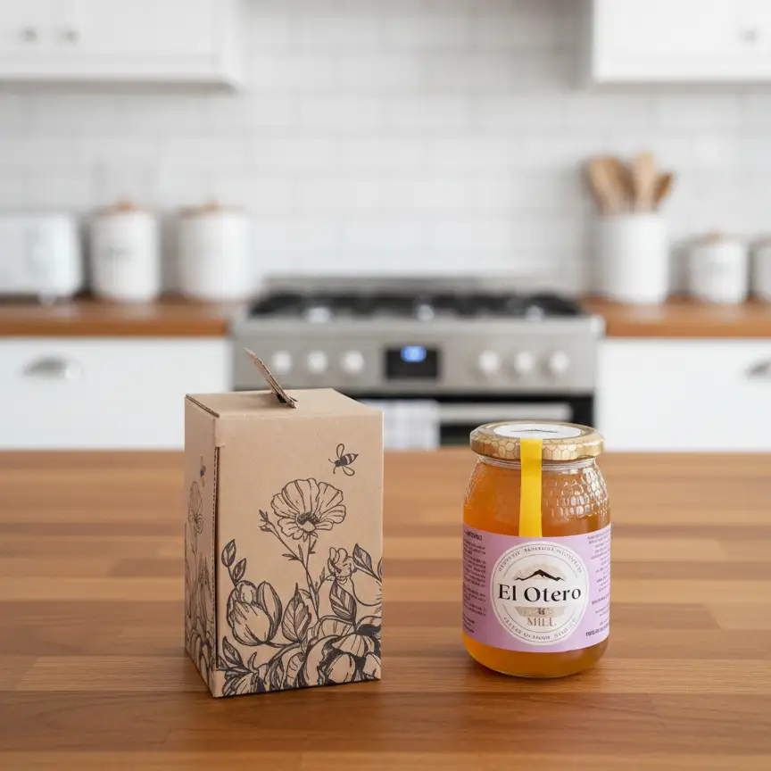 Formato de 500grs en tarro de cristal reutilizable, con tapa de aluminio y con decoración de celdillas.